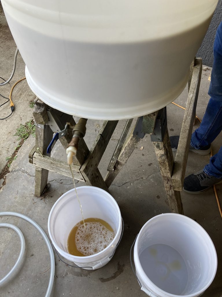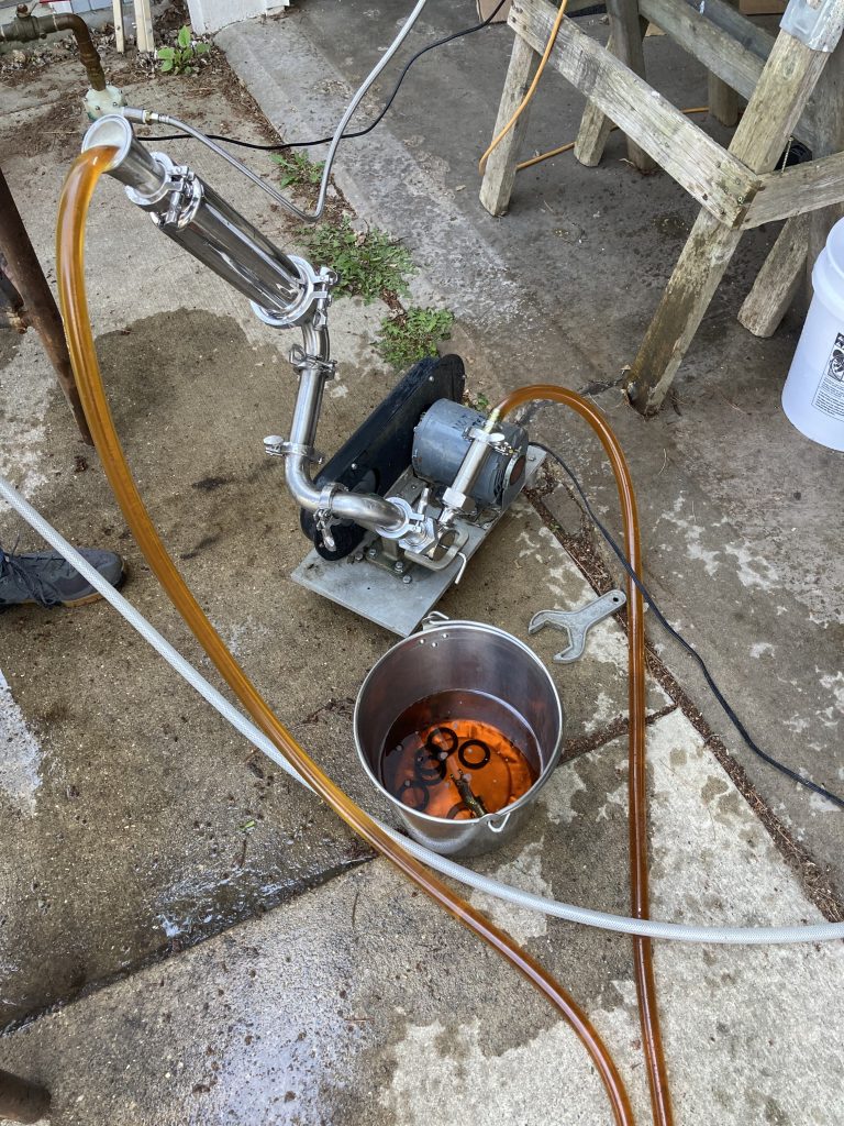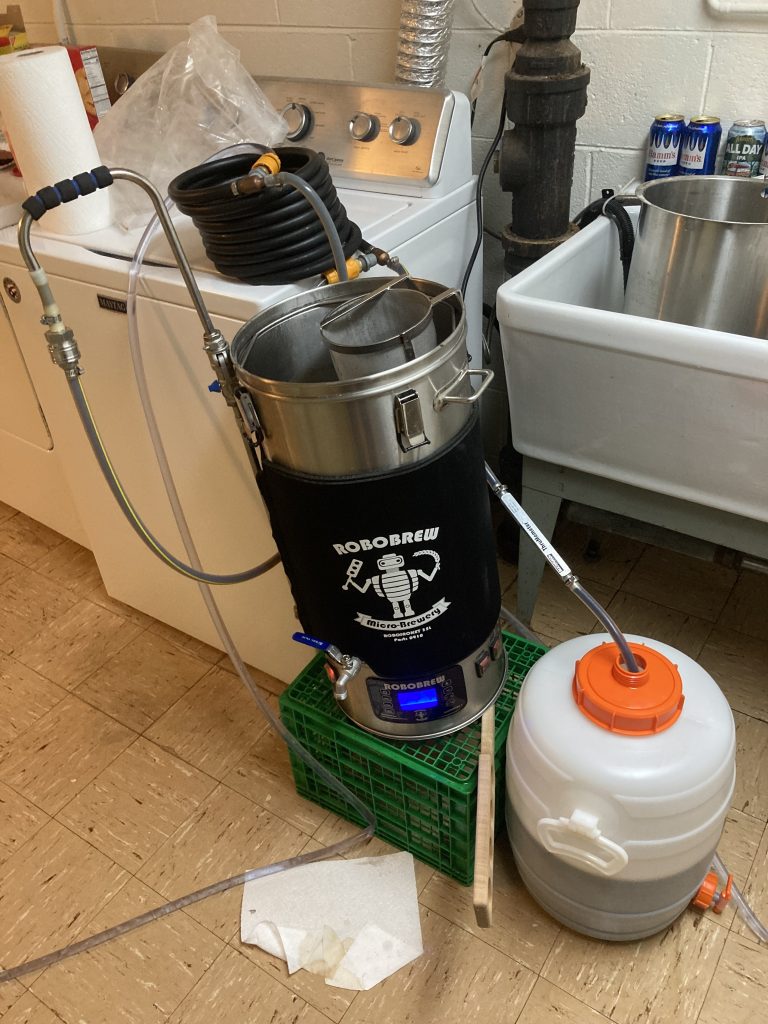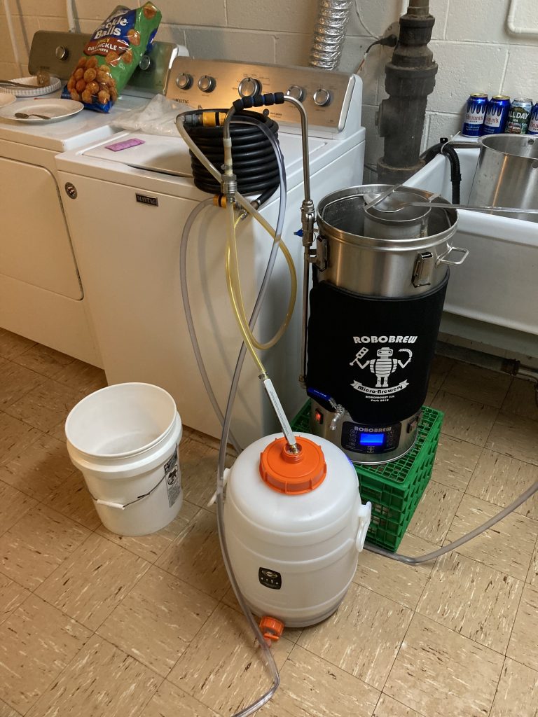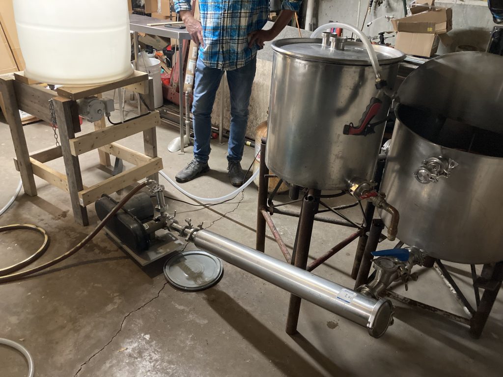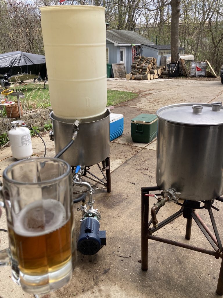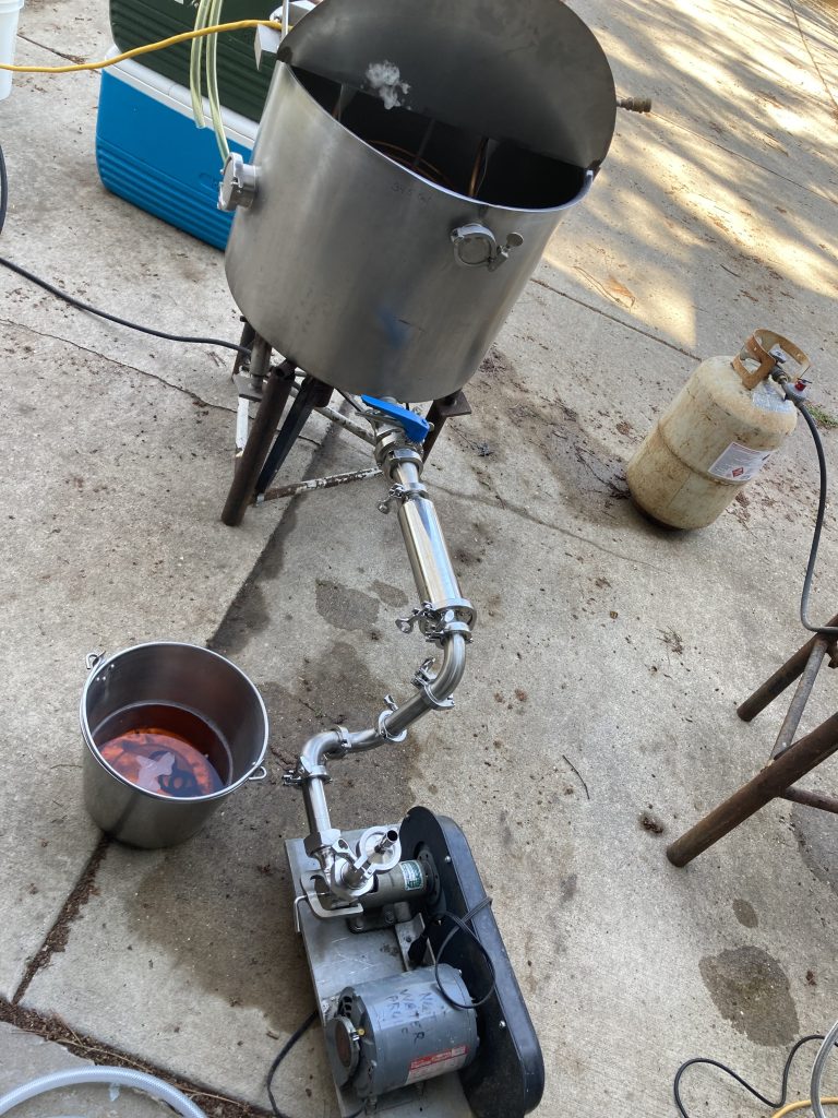 Like all serious garage brewers, constant science and testing is involved. Recent sessions have included design engineering and experimentation with a hop filter. This filter is located in the inline transfer from boil kettle to the fermenter. This upgraded version received a classification of “better” – kinda like my Fantasy Football score this week. Speaking of FF, just throwing this out there from an earlier matchup this season just in case certain readership is present: