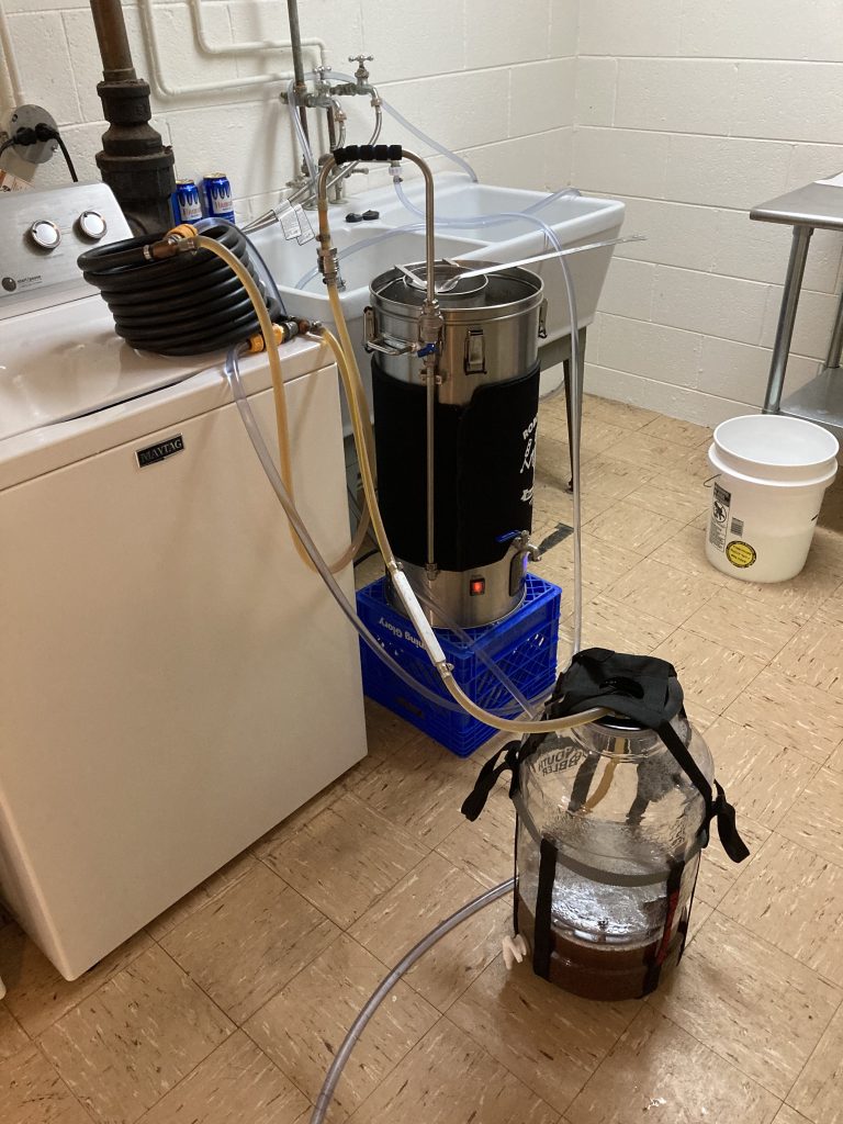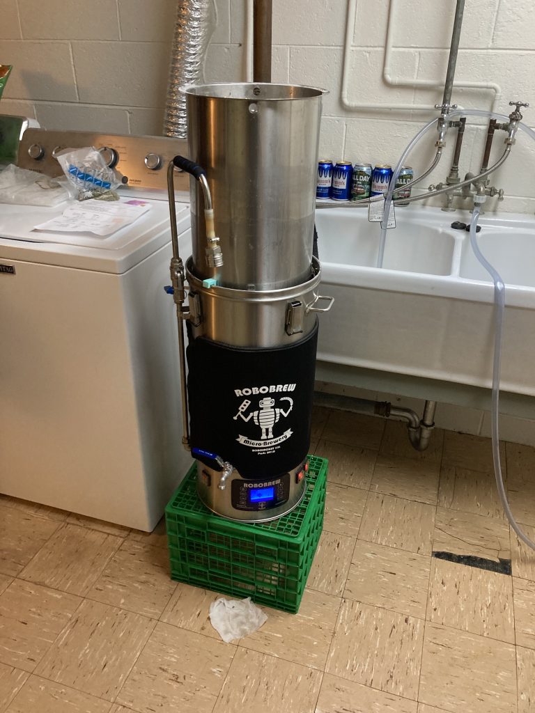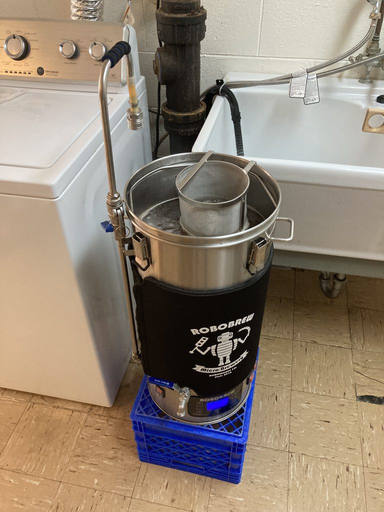 Mark’s BMB opened promptly at 11 am but the author was a tad tardy attempting to squeeze in some schoolwork beforehand. Greg, being somewhat familiar with the brewing process, stepped up to the plate and had the sparge water heating as well as the strike water in the main unit. This move got him an 11% stake in the brew. That is if the beer mice don’t get to it first.