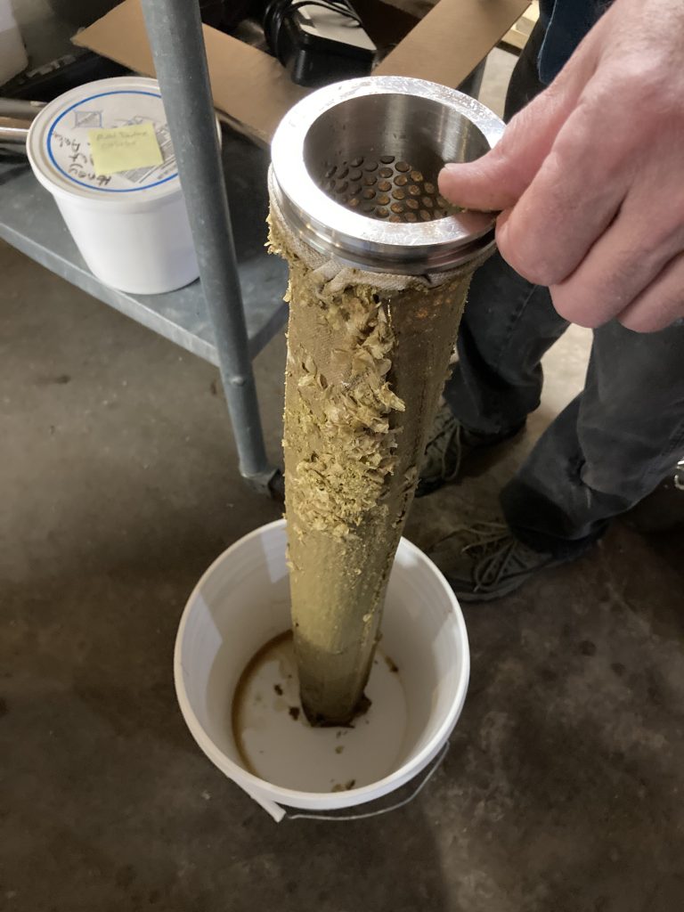 So, the implemented tube filter was an improvement over the previous shorter design but not quite there yet – at least where pellet hops are concerned. The prognosis is that it should perform very nicely with just leaf hops. Almost all of the leaf hops remained in the kettle following the whirlpool and the few that went to the filter didn’t go any further or cause any problems with flow restriction. The pellet hops didn’t behave so nicely – kinda like some middle school kids I work with. The hop debris didn’t hang out in the kettle and caused flow restrictions despite the larger surface area of this larger (longer) tube filter. A hop spider will need to be used with pellet hops until the time when a redesign and test warrant otherwise – if at all. I could envision this device to be used as a hop rocket for a future brew. (Just throwing that idea out there.) The device would need to be reversed for this concept to have a chance at success. (I would think.) Cleaning it might be a bear though. (Never mind.)